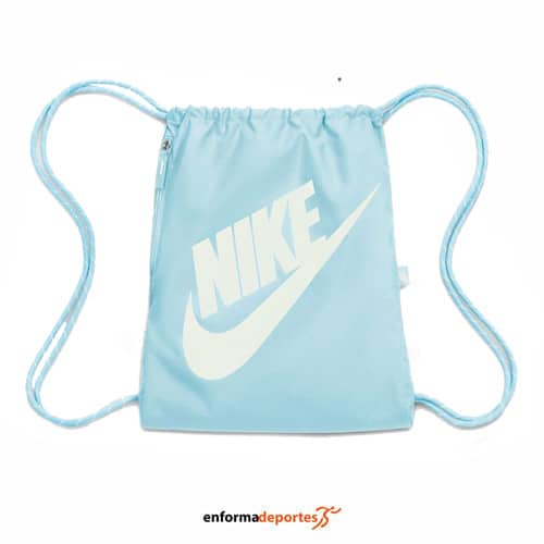Bolsa NIKE HERITAGE DRAWSTRING, con bolsillo cerrado a presión y otro compartimento con cremallera, confeccionada con tejido duradero.