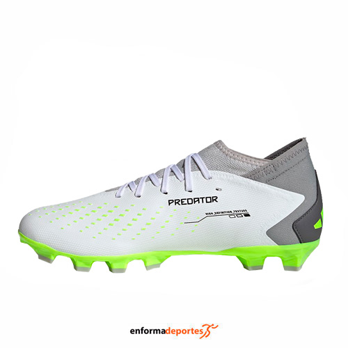 Bota de fútbol hombre ADIDAS PREDATOR ACCURACY 3 MG, presenta un antepié textil revestido de tacto suave y resistente al desgaste con tecnología High Definition Texture que proporciona un excelente agarre y control. La suela versátil te permite dominar el juego en campos de césped natural seco, tierra y césped artificial. La parte superior contiene al menos un 50% de material reciclado. Su objetivo es plantear otra solución más que ayude a acabar con los residuos plásticos, de horma clásica, con cierre de cordones, parte superior textil revestida, forro textil y suela con diseño multisuperficie.