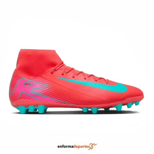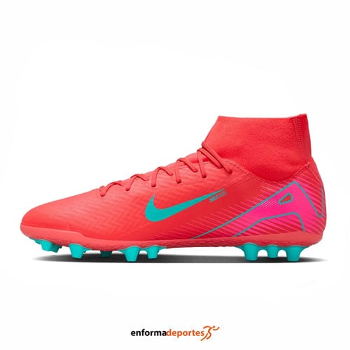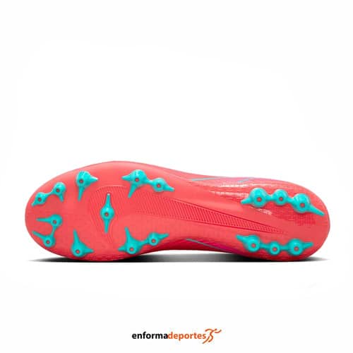 Bota futbol hombre NIKE MERCURIAL SUPERFLY 10 ACADEMY, fabricada en su parte superior de material sintético Nike Skin que ofrece un excelente toque de balón, con calcetín confeccionado con tejido Dynamic Fit que envuelve el tobillo a la perfección, placa de la suela que incorpora la unidad Zoom Air que ofrece una mayor reactividad permitiendo movimientos explosivos y tacos en forma cilíndrica con un agujero en la base que los hacen ideales para su uso en césped artificial.