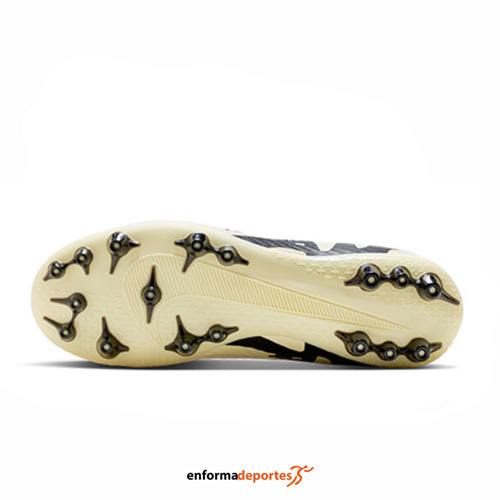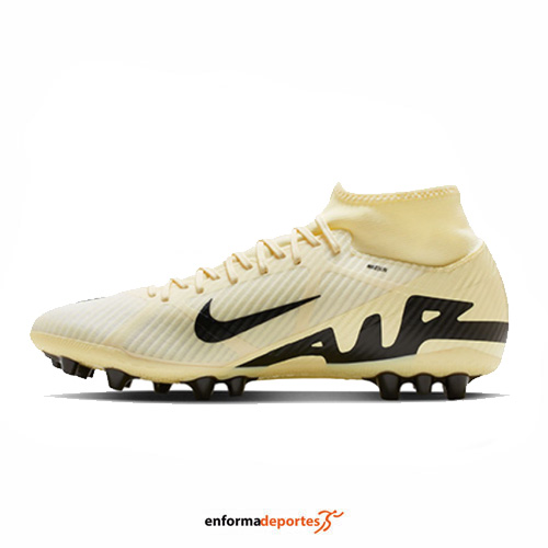 Bota fútbol NIKE ZOOM MERCURIAL SUPERFLY 9 ACADEMY, con puntera de la carcasa de una micro-fibra sintética que se caracteriza por moldearse a los dedos del pie desde el primer uso y con la que tendréis un golpeo óptimo, al ser resistente al agua, con el “calcetín”, una plantilla antideslizante que, junto con la talonera textil acolchada, se encargarán de fijar el pie en su sitio para evitar posibles deslizamientos durante las acciones más agresivas y con suela polivalente AG que se puede utilizar en cualquier terreno de juego, aunque están pensadas para césped artificial.