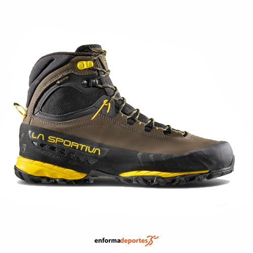 Bota hombre LA SPORTIVA TX5 GTX, estable y cómodo, impermeable y transpirable gracias a la membrana Gore-Tex Extended Comfort, con su parte exterior confeccionada en piel Nobuck blando y confortable, con la puntera reforzada con goma, con suela mezclada súper adherente Vibram MegaGrip con Impact Break System con espesor diferenciado que aumenta el agarre en subida y retiene en bajada.