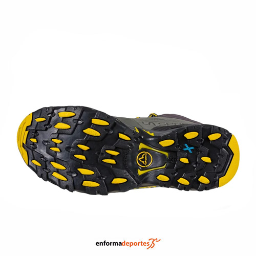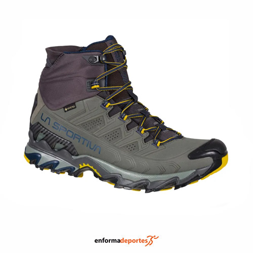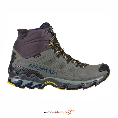 Bota hombre LA SPORTIVA ULTRA RAPTOR II MID LEATHER GTX, confeccionada en su parte superior en nobuk está reforzada con líneas de compresión que garantizan la envoltura del pie y una gran estabilidad, con gran resistencia a la abrasión y transpirabilidad, impermeable y transpirable gracias a la membrana Gore-Tex® Extended Comfort, con cuello suave «Comfort Collar» protege el tobillo de las piedras o barro e incorpora una inserción que facilita al máximo el calzado, con talonera estabilizadora posterior, con plantilla ortholite Mountain Running, media suela memlex Eva inyectada amortiguadora, que proporciona máxima amortiguación y comodidad y suela FriXion Blue altamente resistente a la abrasión, Impact Brake System y puntera de goma antigolpes integrada.