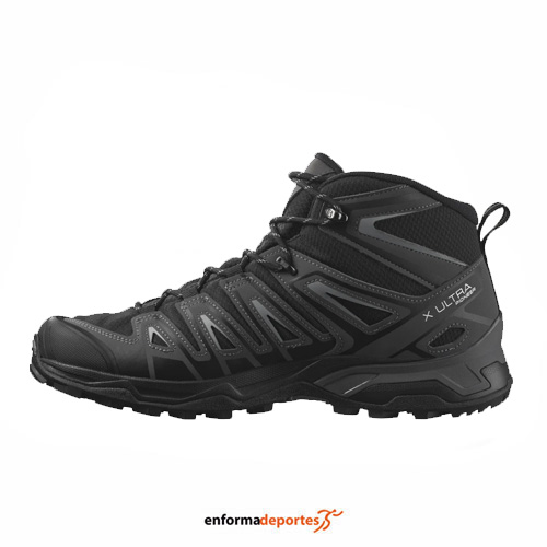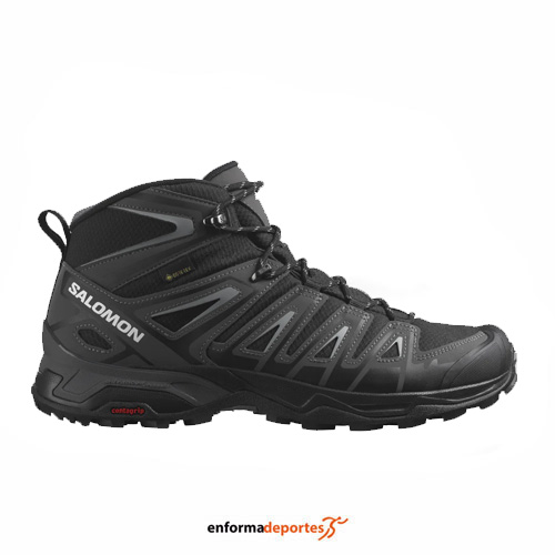 Bota hombre SALOMON X ULTRA PIONEER MID GTX, confeccionada en tejido de malla antipartículas, con forro interior de OrthoLite® moldeada, con entresuela EnergyCell™, con puntera protectora SensiFit™, suela con tacos en espiga, mud Contagrip®, con cierre con cordones para proporcionar mayor ajuste.