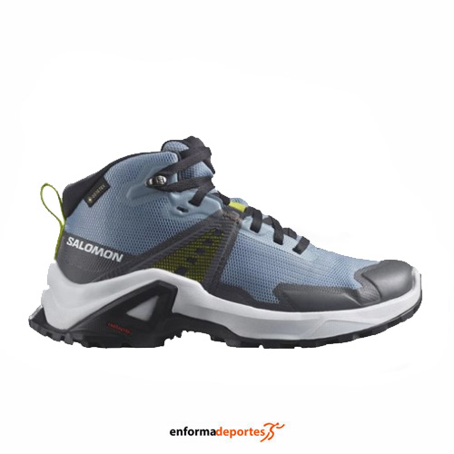 Bota junior SALOMON X RAISE MID GTX, de media caña, con refuerzos y upper con envoltura de piel, material sintético o goma de refuerzo alrededor de la planta del pie para proteger los laterales; con malla ceñida que evita la entrada de suciedad, con membrana Gore-Tex impermeable, con mediasuela con espuma EVA con tecnología Fuze Surge para mayor amortiguación y suela con sistema All Terrain Contagrip que ofrece durabilidad y agarre en todo tipo de superficies.