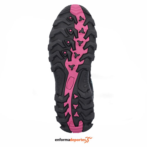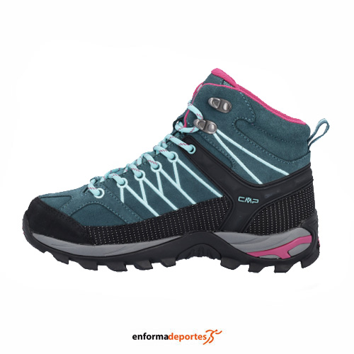 Bota de mujer CAMPAGNOLO RIGEL MID WP, con parte superior confeccionada en malla y membrana impermeable Clima Protect más resistente y transpirable, sistema de soporte del tobillo, con pieza de soporte de TPU en el talón para garantizar estabilidad y soporte durante el apoyo, banda de protección perimetral de fibra más resistente y plantilla OrthoLite con refuerzo de EVA, empeine de piel suede y suela con goma CMP FullOn Grip.