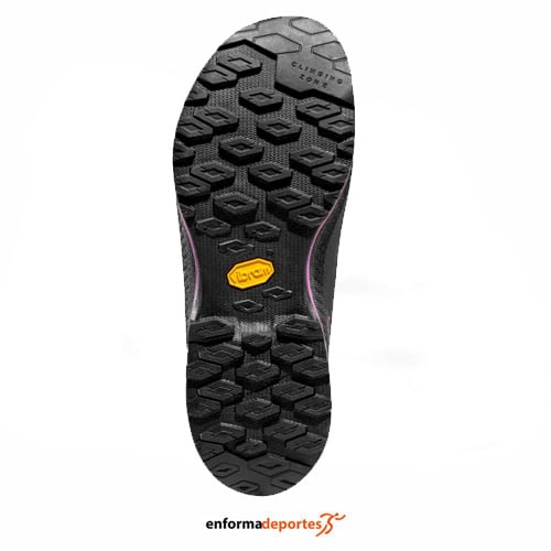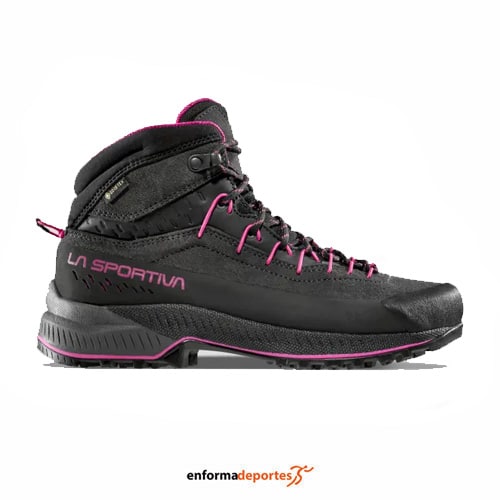 Bota mujer LA SPORTIVA TX4 EVO MID GTX, confeccionada en su parte superior de piel de ante + borde protector de goma y puntera protectora de goma, con recubrimiento Gore-Tex, garantiza transpirabilidad y impermeabilidad, con plantilla Ortholite 4 mm con entresuela compresión EVA, con Flex Zone a la altura del maléolo para garantizar la máxima movilidad y control durante el apoyo del peso, con Resole Platform Impact BRake System, diseñado para una fácil y rápida resuela reemplazando la banda de rodadura con componentes originales suministrados por La Sportiva, con suela Vibram MegaGrip con SII.
