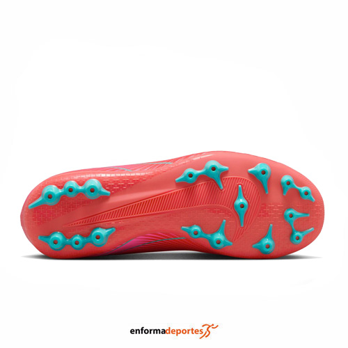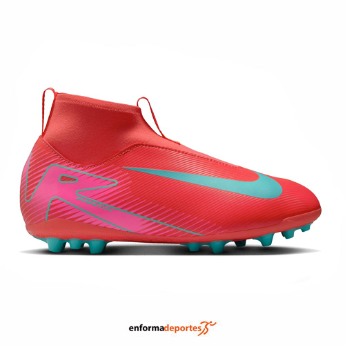Bota de futbol junior NIKE ZOOM SUPERFLY 10 ACADEMY AG, fabricadas en su parte superior con NikeSkin con diseño de chevron integrado para proporcionar un mayor control del balón y hacerte sentir como si estuvieras jugando al fútbol sin zapatillas, con patrón de tracción con ondas incluye una serie de tacos en cascada para que activen una mayor superficie de la unidad Air Zoom, así como para ofrecer la cantidad adecuada de adherencia, gracias a las presillas y la correa se combinan para ofrecer un diseño fácil de poner que prescinde de los cordones y ayuda a darlo todo en el campo. Hemos actualizado la malla elástica de la generación anterior con un tejido Knit adaptable que ofrece flexibilidad, sujeción y un mayor contacto con el balón. La tecnología Dynamic Fit Collar en la zona del tobillo con tejido suave y elástico aporta un ajuste seguro, ideales para uso en superficies de césped artificial alto, con suela interior amortiguada