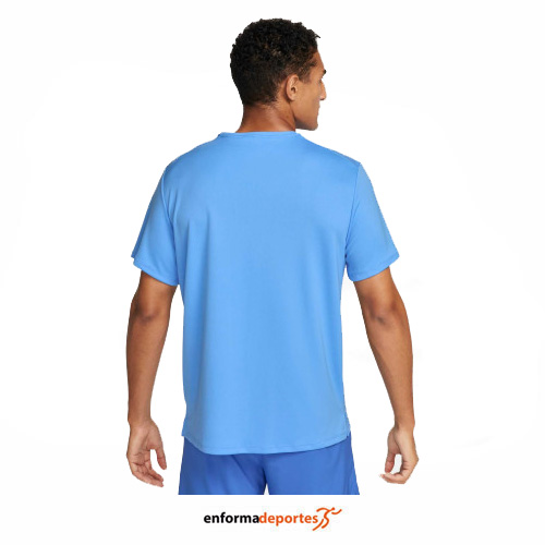 Camiseta hombre NIKE DRI-FIT UV MILER, de corte estándar, cuello redondo y manga corta, confeccionada en tejido 100% poliéster con tecnología DRI-FIT para mantener la transpirabilidad, comodidad, de tacto suave reduce el roce durante las carreras, con costuras de los hombros están desplazadas hacia atrás para que los brazos se muevan libremente, dobladillo curvo amplía la protección en la parte posterior, al tiempo que sus aberturas favorecen la libertad de movimiento y elementos reflectantes.