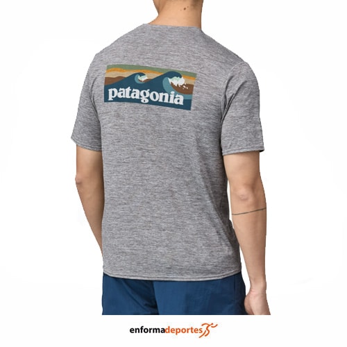 Camiseta hombre PATAGONIA CAP COOL DAILY GRAPHIC SHIRT, confeccionada en tejido jersey 100 % poliéster (50 % reciclado) con un acabado absorbente y control de olores HeiQ® Mint para mantener las cosas frescas, tela elástica de secado rápido, con mangas ajustadas para un mayor movimiento y costuras míminas para reducir rozaduras.