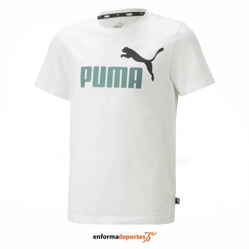 Camiseta junior PUMA ESS+ 2 COL LOGO, confeccionada en tejido 1005 algodón, de corte estandar, manga corta y cuello redondo de canalé.