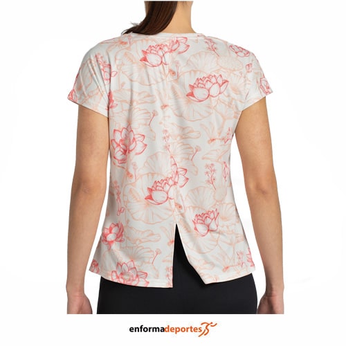 Camiseta mujer +8000 CAONIL, de corte estandar, confeccionada en tejido 1005 poliéster interlock, de manga corta, decorada con un full print de motivos florales, con abertura central en la espalda y logo corporativo en el pecho.