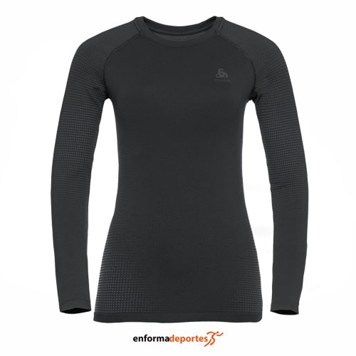 Camiseta mujer ODLO CREW NECK, de manga larga, cuello redondo, confeccionada con tejido 100% técnico, cómoda, confortable, mantiene seco y fresco el cuerpo, tiene capacidad termoreguladora y gran capacidad de libertad de movimientos. Referencia: 196191