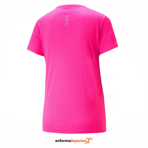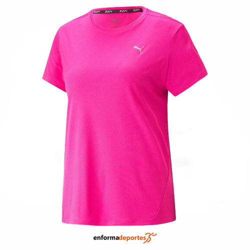 Camiseta mujer PUMA RUN FAVORITE SS, de corte holgado y cómodo, cuello redondo y manga corta, confeccionada en tejido con tecnología Dry Cell, esta camiseta es perfecta para mantenerse fresca y seca, ya que absorbe la humedad del cuerpo y la expulsa hacia la superficie de la tela, lo que permite que la piel respire y se mantenga fresca durante todo el entrenamiento.