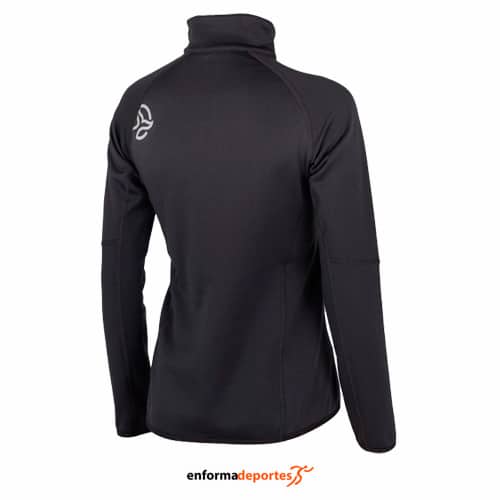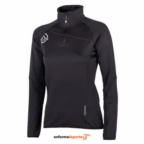 Camiseta de mujer ideal para actividades de montaña, fabricada en tejido Warmshell, material elástico, cálido, transpirable y de secado rápido. Con media cremallera para ventilación externa, costuras planas y protector de barbilla para evitar roces, hueco en la manga para insertar el dedo pulgar y bolsillo pegado en el pecho con cremallera.