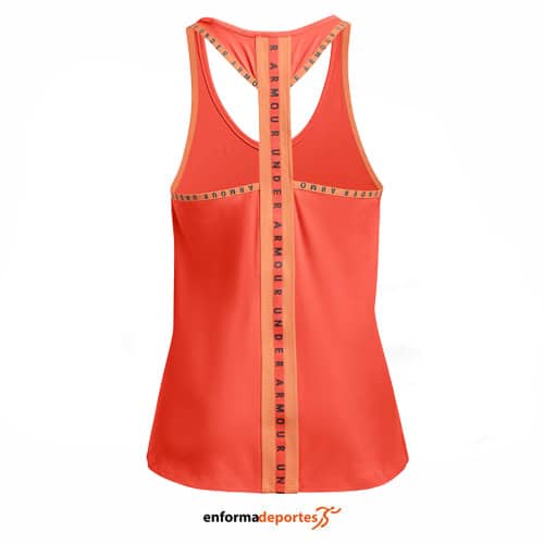 Camiseta UNDER ARMOUR KNOCKOUT TANK, ligera, transpirable, de corte completo para una comodidad total, confeccionada con tejido elástico en 4 direcciones que permite una mayor movilidad y material que capilariza el sudor y se seca rápidamente, con tirantes en forma de T en la espalda con detalles de cinta con logotipo y bajo contorneado y más largo para una mayor protección.