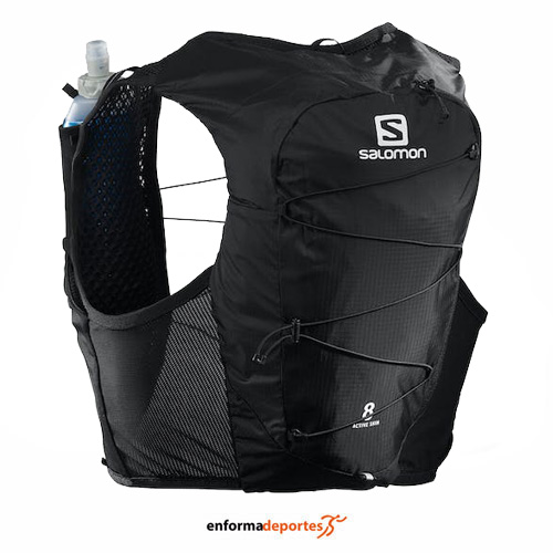 Chaleco hidratación SALOMON ACTIVE SKIN 8, con capacidad de 8 litros, confeccionada en material ligero y tiene un sistema de hidratación, con construcción SensiFit envuelve cómodamente el cuerpo sin obstrucciones y garantiza gran libertad de movimiento; incluye dos botellas de 500 ml, con 1 compartimento principal con cremallera lateral, con 1 compartimento trasero con bolsillo de malla, 1 bolsillo de hombro, 2 bolsillos laterales con cremallera.