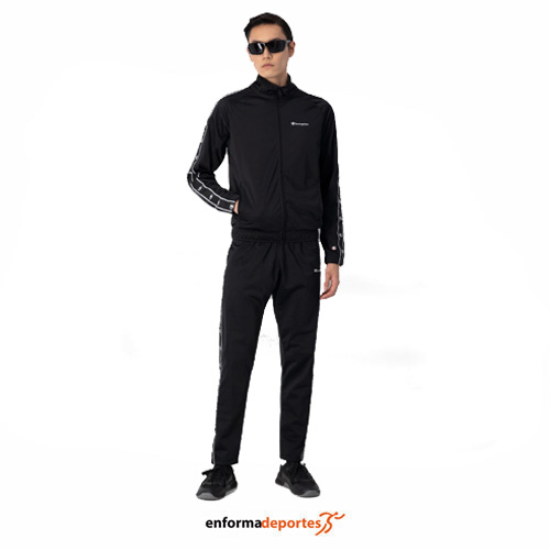 Chandal hombre CHAMPION TRACKSUIT, confeccionadao en tejido polyWarpKnit Semi Dull especial de 200 g/m², poliester, con inserciones de cinta de jacquard, de corte holgado, su parte superior con cremallera entera y bolsillos laterales, con pantalon de bajo recto, bolsillos laterales y cintura con cordón de ajuste.