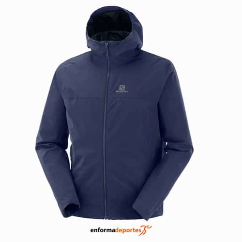 Chaqueta de hombre SALOMON EXPLORE WP, confeccionada con tecnología AdvancedSkin Dry, waterproof, de corte regular, con capucha fija, puño elástico, costuras selladas, forro de malla transpirable, cremallera frontal completa, bolsillos de mano con cremallera, elementos reflectantes y dobladillo inferior abrochado con la parte trasera más larga.