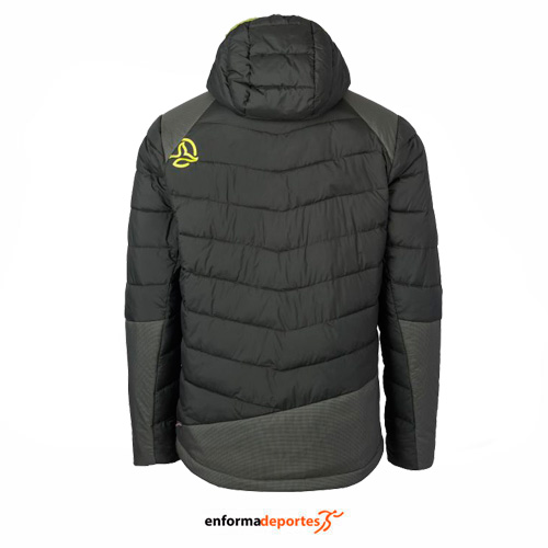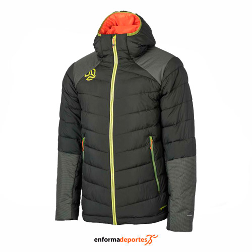 Chaqueta TERNUA YAKSAM, técnica, con elevado aislamiento térmico, con relleno interior PRIMALOFT THERMOPLUME (300gr), con tejido exterior sonen nylon y poliéster reciclados, con 2 MICROSHELL exteriores (liso y ripstop) aportan protección contra el viento y repelencia al agua, con gran resistencia a la abrasión incrementada en hombros, antebrazo y trasera con el tejido Ripstop, con capucha fija, con tratamiento de repelencia al agua libre de PFC’s y sus tejidos tienen la certificación BLUESIGN(R). Además, es comprimible para su fácil transporte.