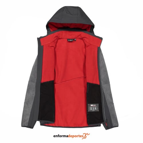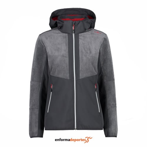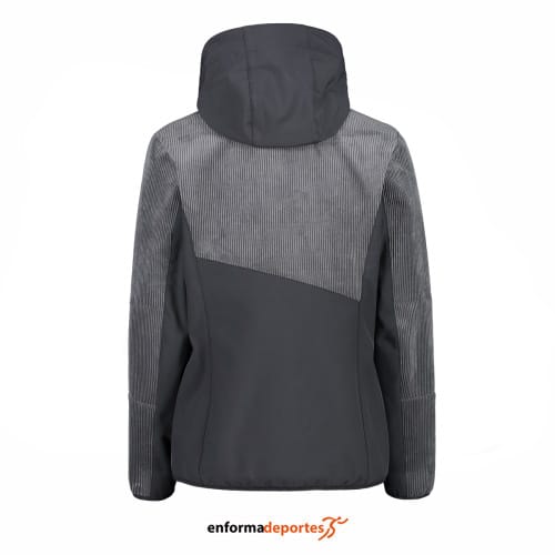 Chaqueta mujer softshell  CAMPAGNOLO, con inserciones especiales de pana en la parte delantera, trasera y mangas, con membrana Clima Protect, aplicada entre los tejidos, protege de las inclemencias del tiempo. Equipado con dos bolsillos frontales, todos con cierre de cremallera. Capucha desmontable y ajustable, bajo y puños elásticos, completan la prenda.