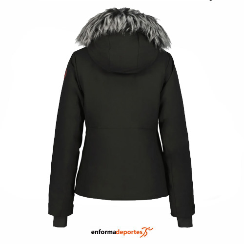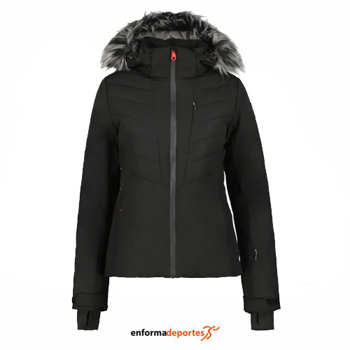 Chaqueta mujer ICEPEAK ELEELE, con capucha desmontable con interior de pelo sintético, puños ajustables, polainas para nieve fijas en las aberturas de las piernas con banda de silicona antideslizante, con gran bolsillo interior de malla, con bolsillo interior con cremallera, bolsillo para forfait en la manga, con cremallera frontal hidrófuga con protector de barbilla en la cremallera frontal, dobladillo ajustable, impermeable con columna de agua 10 000 mm y transpirabilidad 5 000 gm224h, con acolchado de imitación de plumón que proporciona un excelente aislamiento térmico en relación con su peso ligero. Hecho de un tejido de 2 capas, en el que una membrana impermeable está unida a un material multifuncional. El material elástico en 2 direcciones aumenta la libertad de movimiento. La superficie del tejido ha sido tratada con un acabado hidrófugo. Aislamiento cálido.
