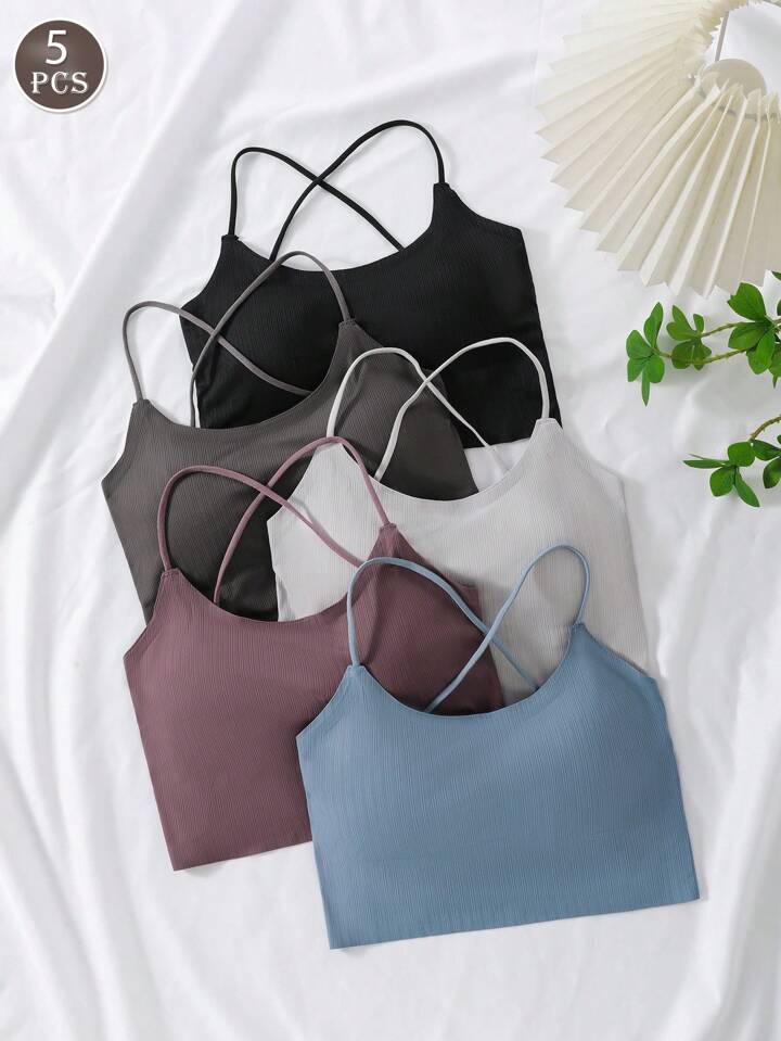 Bralette tipo crop sin costuras y sin aros, con espalda cruzada y tirantes delgados. Confeccionado en poliamida elástica, con almohadillas extraíbles para soporte ligero. Ideal para uso diario o descanso. Prenda individual.