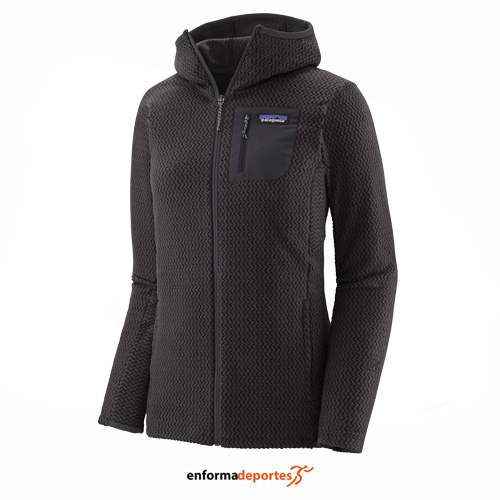 Forro polar mujer PATAGONIA R1 AIR, confeccionada en tejido vellón jacquard de poliéster 100 % reciclado con hilos de núcleo hueco presenta una textura en zigzag única que absorbe la humedad, se seca rápido y es altamente transpirable para actividades de alto rendimiento, con costuras fuera de los hombros se asientan cómodamente debajo de las correas de la mochila, con bolsillo en el pecho izquierdo para guardar fácilmente artículos pequeños,  dos bolsillos delanteros con cremalleras mínimas para reducir el volumen, ligero y comprimible, con tejido de secado rápido en el dobladillo trasero y los puños para mayor elasticidad y mejor ajuste, con cremallera frontal completa para una fácil ventilación y una capucha ajustada para usar debajo de cascos y capuchas.