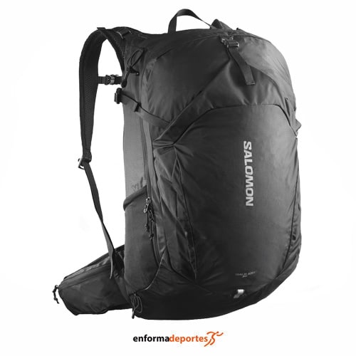 Mochila SALOMON TRAILBLAZER 30, impermeable y resistente al agua, con capacidad para 30 litros, con sistema de respaldo con almohadillas EVA, con correas de hombro con panel 3D Airmesh, cinturón ajustable, 1 compartimento principal, 2 bolsillos laterales de malla, con compartimento interno para bolsa de hidratación de hasta 2 litros, detalles reflectantes, con malla tridimensional que proporciona más ventilación y amortiguación y dimensiones: ancho 280mm x alto 520mm.
