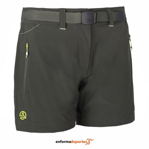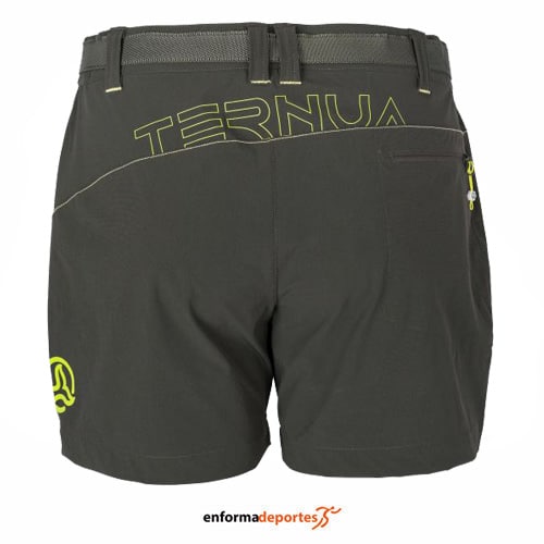 Pantalón corto mujer TERNUA FRIZA, confeccionado en tejido polyamida bi-elástica SHELLSTRETCH, elástico, de secado rápido, muy cómodo y con patrón regular, con protección rayos UVA 30+ y con tratamiento repelente al agua (DWR), cintura mixta con cinturón, bajos ajustables con tanca y bolsillos con cremallera. Libre de tóxicos PFC’s y un tejido certificado con OEKO-TEX(R) y BLUESIGN(R).