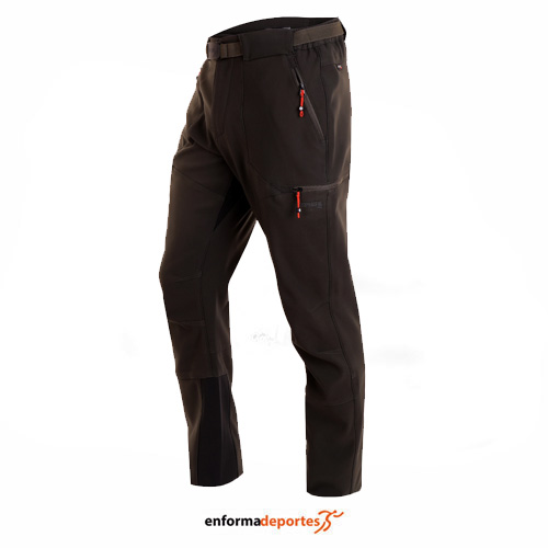 Pantalón hombre SPHERE LIKEN, confeccionado en tejido poliéster y elastano, tejido tratado con DWR repelente al agua, corta viento y transpirable, con interior perchado, con cintura semi-elástica con cierra de botón corchete y cinturón elástico ajustable, cinco bolsillos con cremalleras invertidas a contraste, refuerzo con cordura en la entrepierna y los bajos, pinzas en las rodillas, cremallera y cierre ajustable con botón a presión en los bajos, logo bordado.