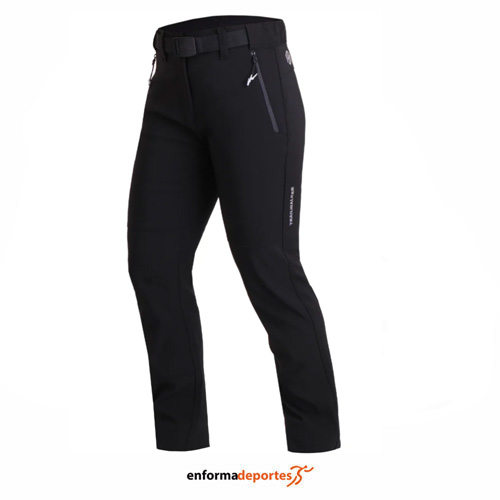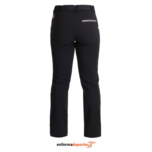 Pantalón mujer SPHERE PRO POLIANA, confeccionado en tejido poliester y elastano, con tratamiento DWR repelente al agua, corta viento y transpirable, con cintura semi-elástica con cierre de botón corchete a presión y cinturón elástico ajustable, tres bolsillos con cremalleras, pinzas en las rodillas, goma ajustable en los bajos, logos reflectantes.
