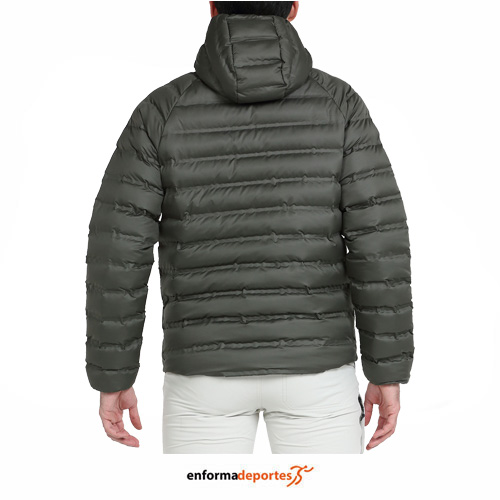 Plumas hombre +8000 GREC, con chaqueta de relleno sintético, confeccionada en tejido exterior en poliéster 50D, relleno calidad Pumpfiber; aislante, resistente al agua y ultraligero, con construcción de cámaras mediante sellado, este acabado mejora la resistencia al agua de la prenda, bolsillos laterales con cremalleras y puños y contorno de capucha rematado con vivo elástico y bajo rematado con tankas.