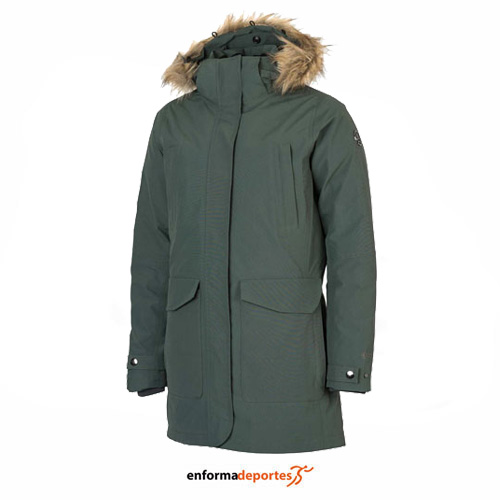Parka de mujer, TERNUA SOUTH RIVER, confeccionada con tejido impermeable Gore-tex y con 220gr de relleno de plumón de ganso reciclado Neokdun (700 cuins), 220g de aislamiento, calidez y confort. Con 4 bolsillos delanteros y 1 interno, capucha desmontable y ajustable (con pelo alrededor), cálida, con puños ajustables con velcro para evitar la pérdida de calor, y con tratamiento de repelencia al agua (DWR) libre de PFC’s. Tejido con certificación BLUESIGN(R), ganadora de premio GOLD ISPO AWARD.