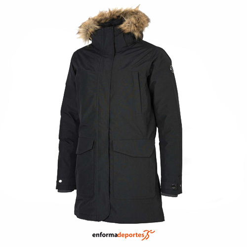 Parka de mujer, TERNUA SOUTH RIVER, confeccionada con tejido impermeable Gore-tex y con 220gr de relleno de plumón de ganso reciclado Neokdun (700 cuins), 220g de aislamiento, calidez y confort. Con 4 bolsillos delanteros y 1 interno, capucha desmontable y ajustable (con pelo alrededor), cálida, con puños ajustables con velcro para evitar la pérdida de calor, y con tratamiento de repelencia al agua (DWR) libre de PFC’s. Tejido con certificación BLUESIGN(R), ganadora de premio GOLD ISPO AWARD.