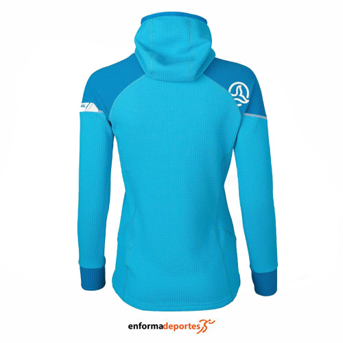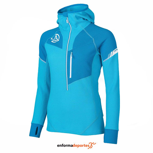 Power strech mujer TERNUA RAPID TOP, confeccionado en tejido con tecnología Warmshell, muy ligero y transpirable que es elástico, compactable y duradero, de corte ajustado, con diseño ergonómico para máxima libertad de movimientos, caliente y muy transpirable, incorpora una capucha estilo balaclava con media cremallera, con protector de barbilla, un bolsillo frontal, un  orificio para pulgar en la mangas y con costuras planas flatlock.