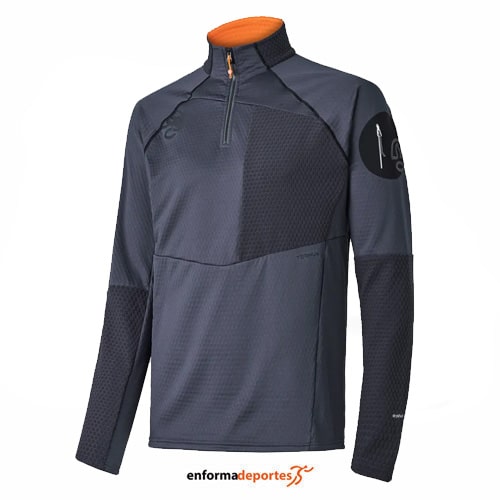 Pullover hombre TERNUA RAGGER, segunda capa de media cremallera en tejido reciclado DRYSHELL, elástico y transpirable, cuenta con bolsillo en mangas, costuras planas, cremalleras YKK, protector de barbilla y tratamiento DWR, ofrece libertad de movimiento y resistencia al pilling.