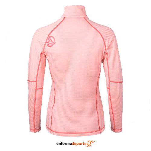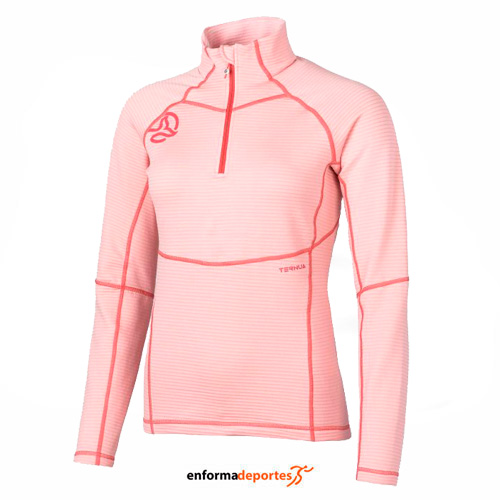 Pullover mujer TERNUA MOMHILL, confeccionado en tejido reciclado con tratamiento eco, incorpora media cremallera hecha en tejido WARMSHELL reciclado, ligera, cálida, transpirable y de secado rápido, tejido elastico proporciona una excelente libertad de moviminentos, con costuras planas, protector de barbilla para evitar el roce de la cremallera, amplio bolsillo de pecho con cremallera, muy buena resistencia al pilling, con superficie interior estructurada para optimizar el transporte del sudor y aumentar el aislamiento térmico, con tratamiento de repelencia al agua (DWR) libre de PFC’s.