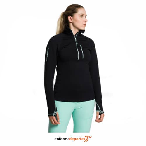 Pullover técnico mujer TRANGO TRX2 STRETCH EVO, confeccionado con tejido Polartec® Power Stretch® Pro™, destaca por su resistencia, elasticidad y adaptabilidad al cuerpo, con estructura bi-elástica que proporciona un ajuste ceñido y cómodo, ideal como capa intermedia en esquí de montaña, alpinismo o escalada, con cuello alto con abertura de cremallera permite regular la ventilación, mientras que los puños con salida para el pulgar mejoran la retención térmica y la estabilidad de la prenda, costuras planas Flatlock (4 agujas) que evitan rozaduras y aumentan la durabilidad, incluye un bolsillo pectoral con cremallera para objetos esenciales.