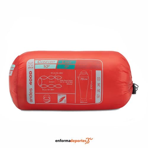 Saco de domir ALTUS ANDES 400 H30, con un relleno de pluma (duvet 90/10) de 700 cuins y 180 g de peso, ofrece una excelente capacidad de aislamiento en un diseño compacto y eficiente. El peso total del saco es de 400 g, lo que lo convierte en una opción ultraligera ideal para aventuras donde cada gramo cuenta.