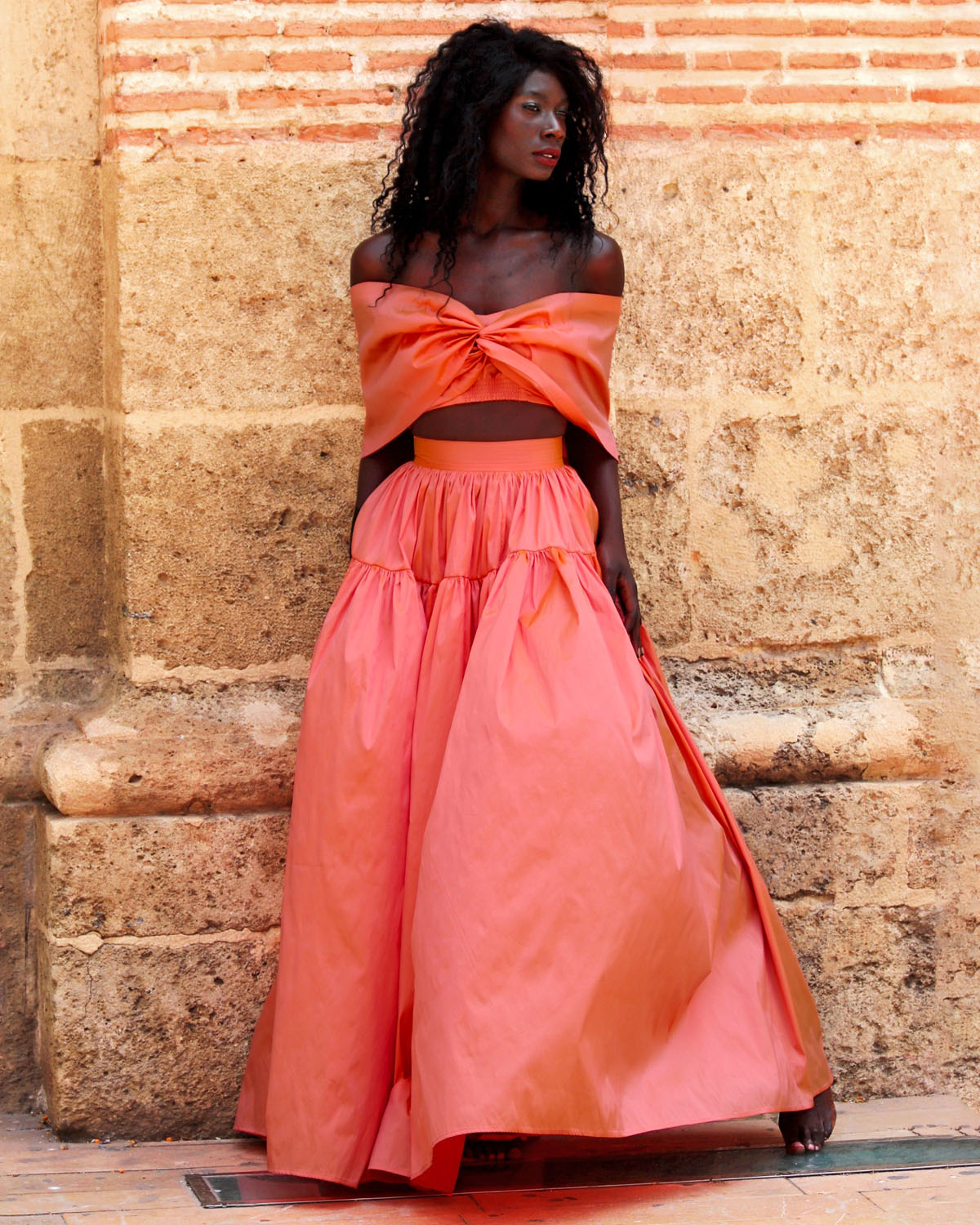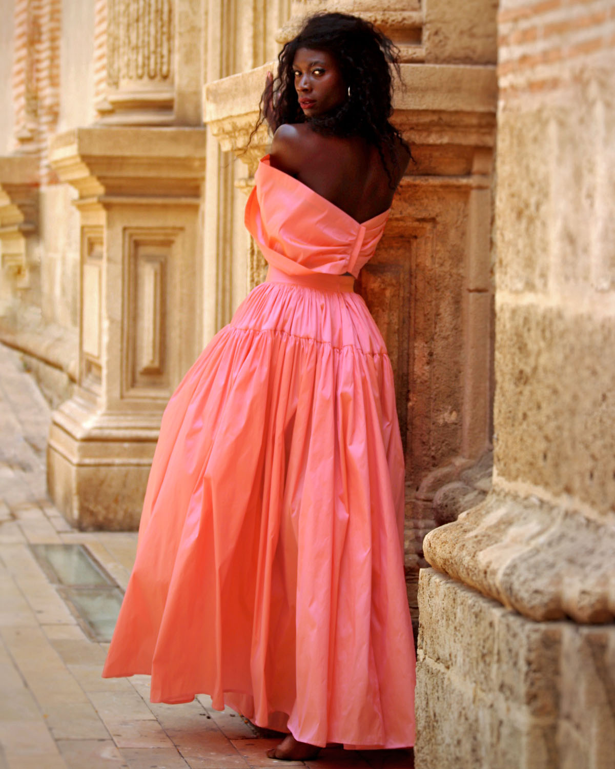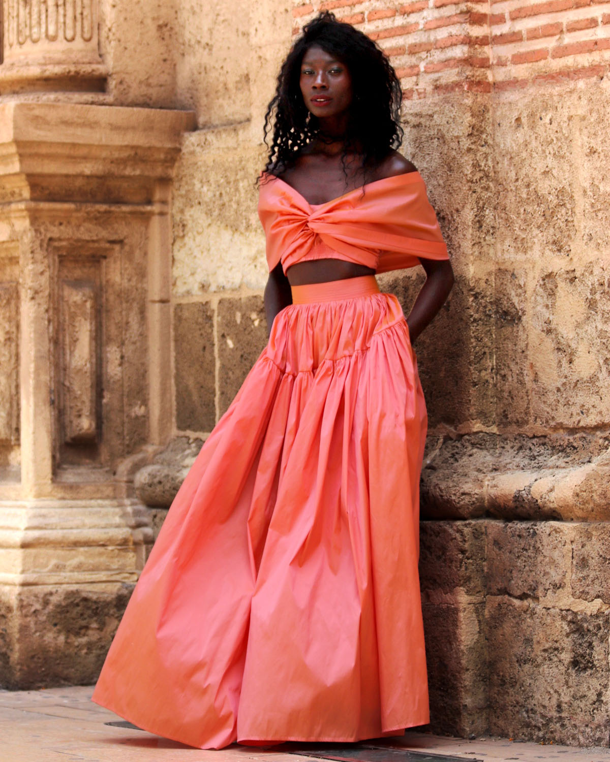 El tafetán es un tejido de armadura simple, elaborado con hilos de fibras sintéticas de alta calidad, que se caracteriza por su textura ligeramente rígida, su cuerpo estructurado y su brillo delicado. Es un material ideal para confecciones de fiesta, ceremonia y pasarela, ya que mantiene con precisión los volúmenes y pliegues del diseño, aportando una silueta escultural y elegante. Este tafetán, seleccionado específicamente para los diseños de Lyubasha Kyleshko, tiene un tacto suave pero firme, un acabado satinado con reflejos sutiles y una caída controlada que permite trabajar drapeados, vuelos o nudos sin perder definición. Además, su interior forrado en el mismo tejido ofrece una sensación envolvente y de lujo absoluto.