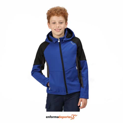 Chaqueta softshell junior REGATTA EASTCOTT, confeccionada en tejido elástico softshell XPT, con capucha, con acabado repelente al agua, impermeable y resistente al viento, con cierre y bolsillos laterales con cremallera y con elementos transpirables y reflectantes.