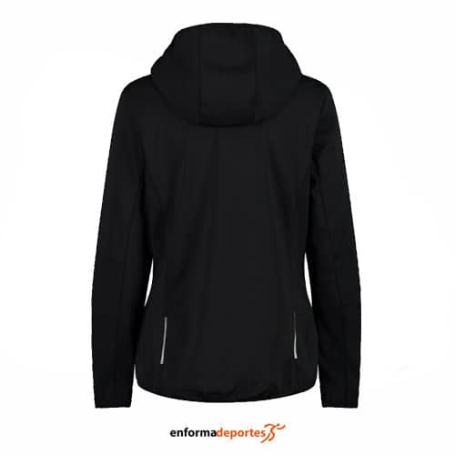 Softshell mujer CAMPAGNOLO JACKET ZIP HOOD, confeccionada en tejido repelente al agua (WP 7.000) y al mismo tiempo garantiza transpirabilidad (MVP 3.000) gracias al laminado especial térmico microporoso Clima Protect, con cierre con cremallera completa, protector de barbilla, capucha fija y bolsillos laterales con cremallera.