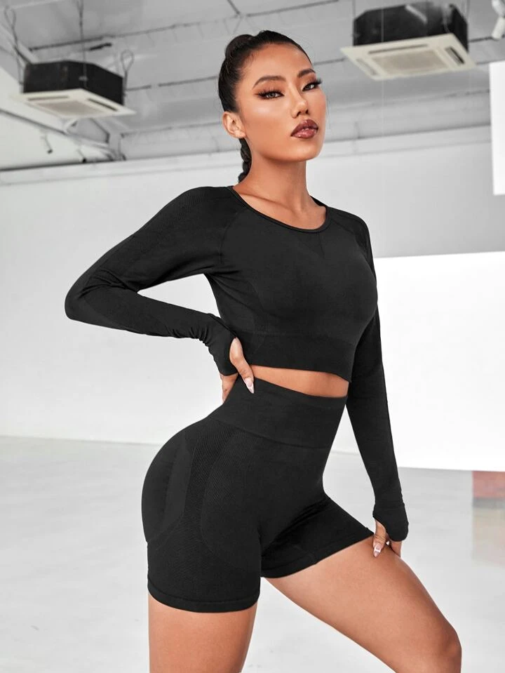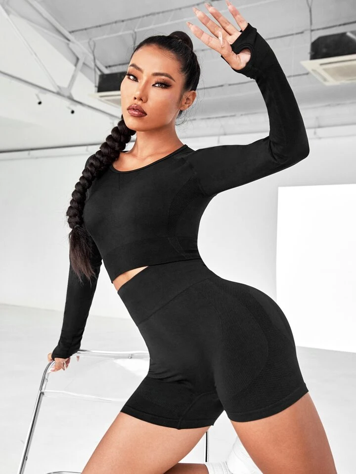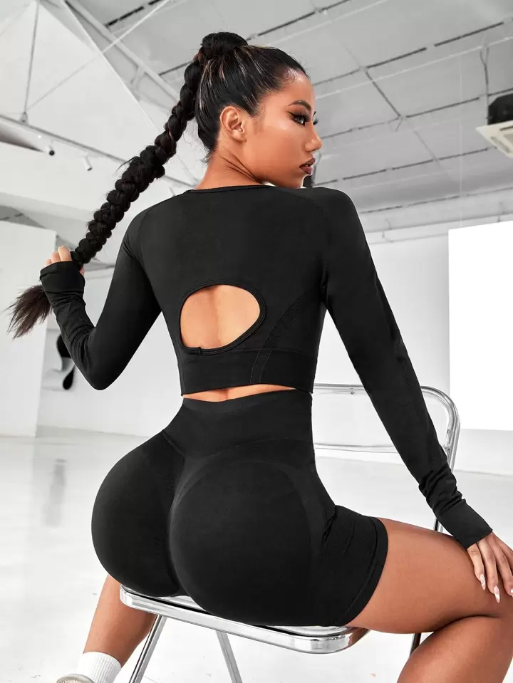 Conjunto deportivo de 2 piezas: crop top de manga larga con orificios para los pulgares y espalda abierta, más shorts ajustados con cintura elástica. Diseño sin costuras y tejido elástico de alta compresión. Ideal para yoga, entreno o uso diario.