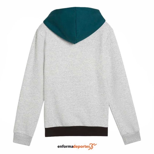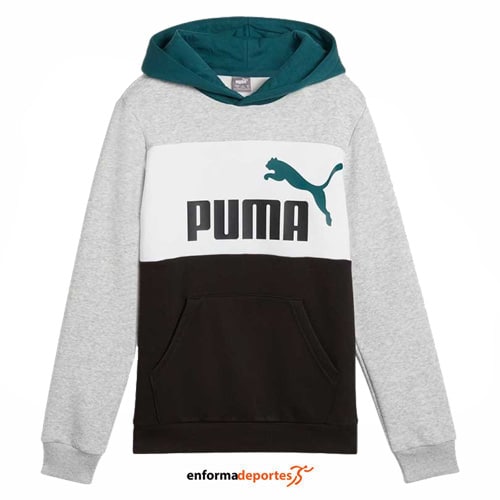 Sudadera junior PUMA ESS BLOCK HOODIE FL DESERT DUST, confeccionada en tejido algodón y poliéster, de corte holgado, con capucha fija, tejido suave, con bolsillo tipo canguro y ribetes acanalados en puños y dobladillo.