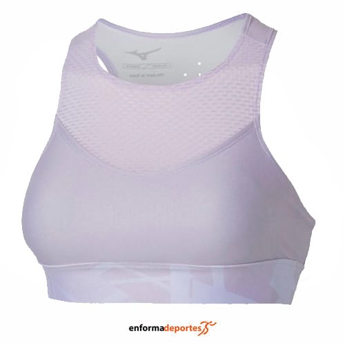 Top mujer MIZUNO DAYBREAKERS PADDED, confeccionado en tejido poliéster, con almohadillas extraíbles para proporcionar un soporte seguro, panel de malla frontal, corte láser en la parte posterior.