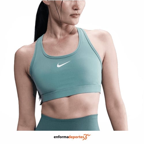 Top mujer NIKE SWSH MED SPT, de soporte medio, ajuste adherente, forro mesh, confeccionado en tejido poliéster con tecnología DRI-FIT, con cuello redondo con cinta interna, acolchado cosido y no extraíble, banda elástica debajo del seno para un fit suave y espalda en forma de X para mayor comodidad y libertad de movimientos.