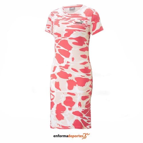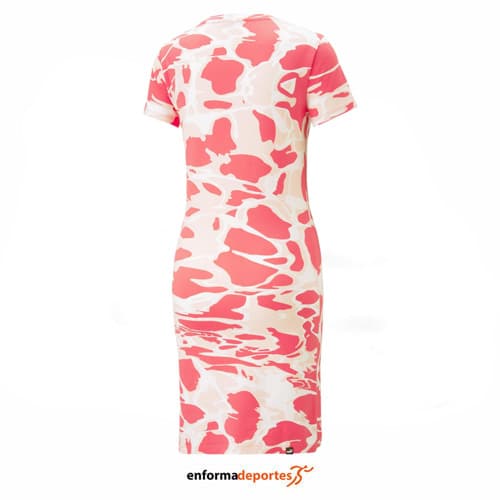 Vestido mujer PUMA SUMMER SPLASH AOP, de corte ajustado, cuello redondo, manga corta y con estampado integral.