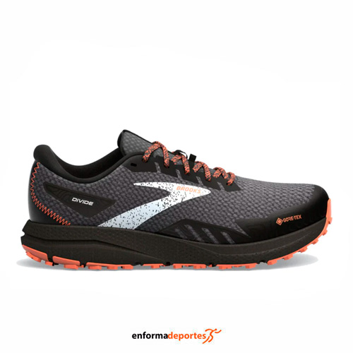 Zapatilla hombre BROOKS DIVIDE 4 GTX, de pisada neutra, confeccionadas en su parte superior de malla transpirable, con membrana gore-tex impermeable para ofrecer una protección resistente , con tracción fiable, cierre con cordones, con amortiguación estándar.