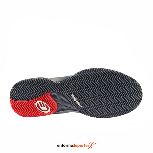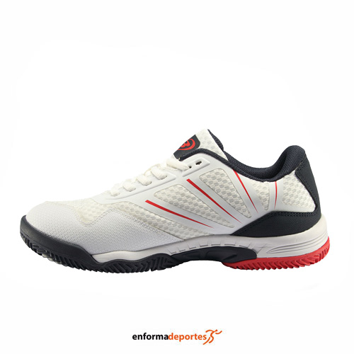 Zapatilla hombre BULLPADEL BEKER, diseñada y pensada para todos los jugadores de nivel y frecuencia media/alta que busquen un calzado flexible y transpirable, con protección en la puntera de goma de refuerzo inyectada y sin costuras, con alta resistencia a la abrasión, y por su forro interior de “mesh” textil, que aporta confort y mejora la transpirabilidad, con una suela perfecta para las pistas de pádel, fabricada en caucho de alta densidad con un dibujo en espiga de 3mm de profundidad, y cuyo diseño ayuda a sentir el máximo agarre y flexión del pie. Además, incorpora un estabilizador central fabricado en TPU, que mejora el equilibrio y refuerza la estructura central del arco del pie.