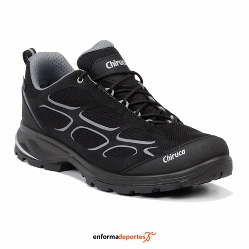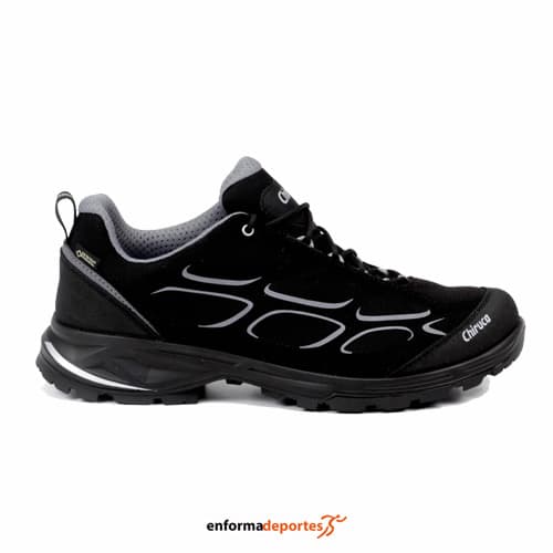 Zapatilla chiruca MUNDAKA, confeccionada en material textil, con refuerzo en puntera y trasera, detalles de alta frecuencia, membrana forro Gore-Tex Extended Confort y suela poliuretano 2 densidades. Peso: 378 g.